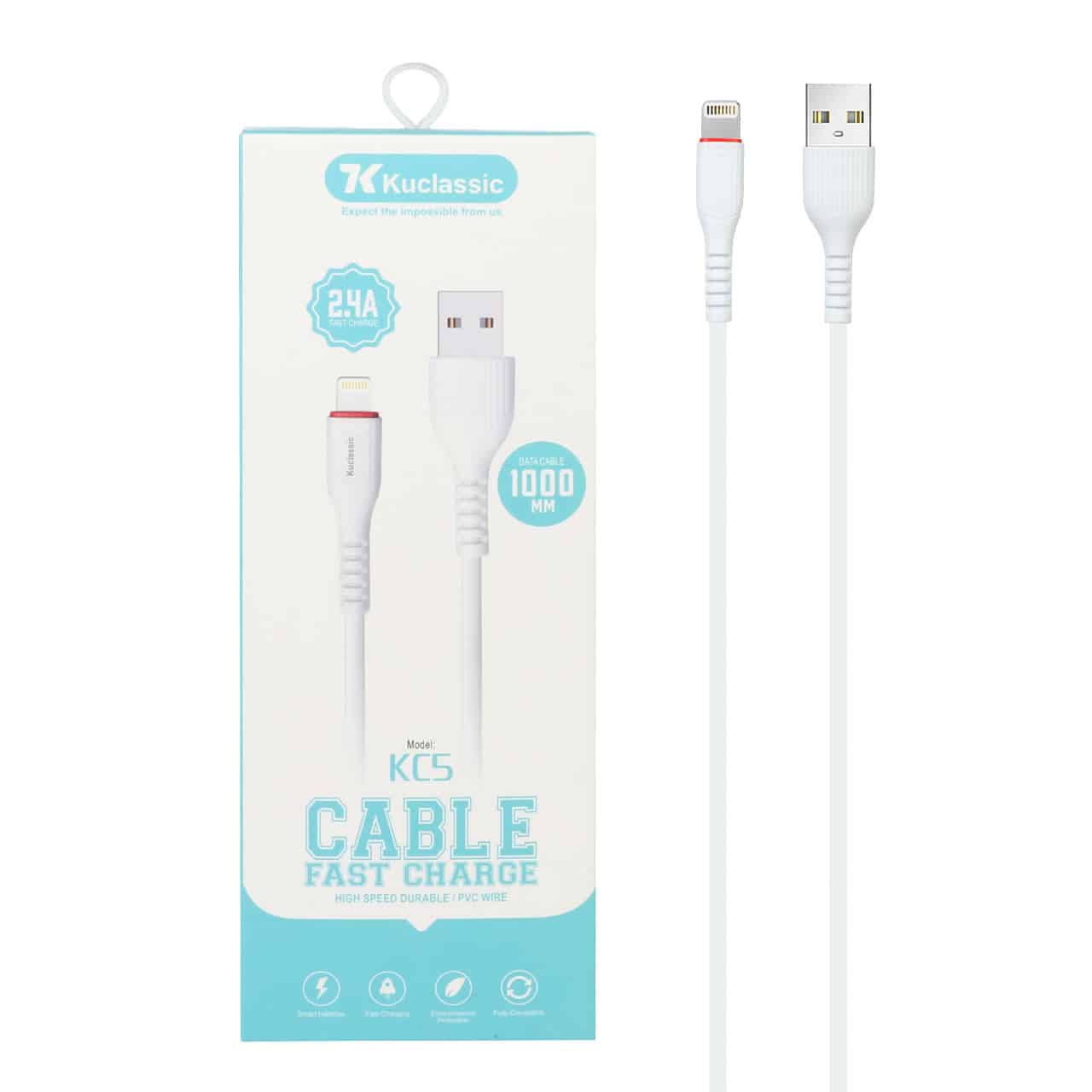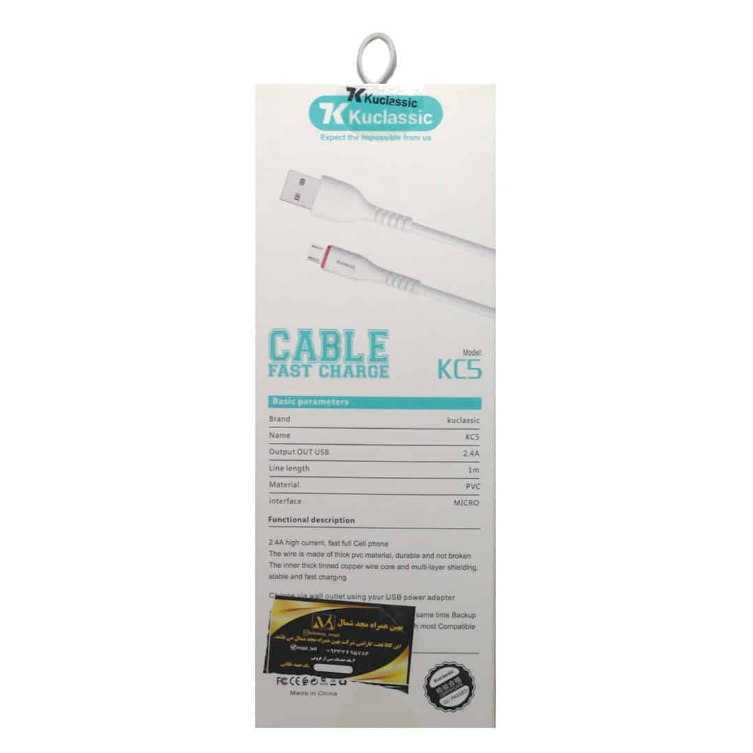 کابل شارژ KC5 به صورت فست شارژ می باشد با خروجی 2.4A پشتیبانی می کند جنس بدنه کابل بسیار مقاوم از نوع PVC است که در برابر پارگی و پیچ خوردگی دوام بالایی دارد همچنین طول این کابل یک متر است ک فاصله مناسبی رو تا دستگاه شما فراهم می کند . این کابل قابلیت انتقال داده را دارد